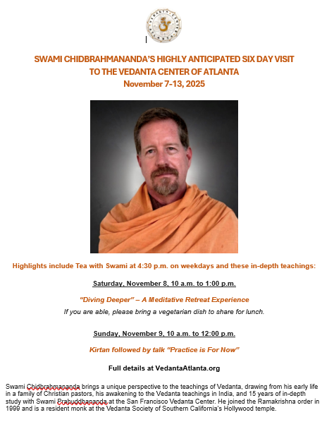 We study Hinduism and Vedanta as taught by Sri Ramakrishna, Sri Sarada Devi, Swami Vivekananda, and Swami Brahmananda. There is no charge for classes, talks, worship, meditation, retreats and special events held throughout the year. All are welcome.